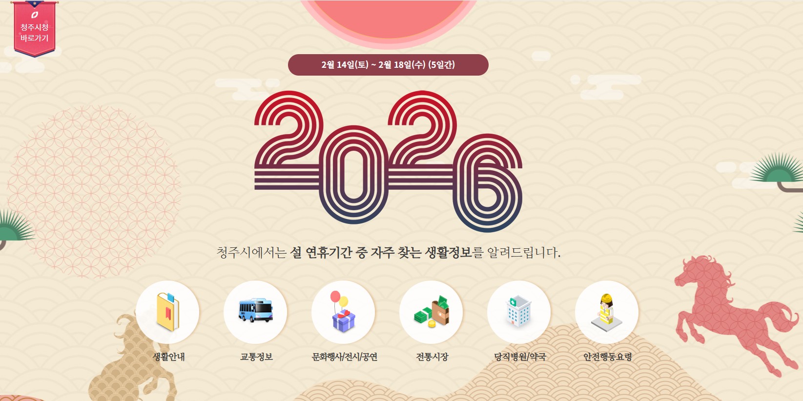 12~18일 교통·생활편의·문화행사·당직 의료기관 등 생활정보 제공 청주시는 오는 12일부터 18일까지 시민들에게 설 연휴 기간에 필요한 생활 정보를 제공하기 위해 ‘평안한 명절 보내기’ 누리집을 운영한다고 밝혔다. 이번 특집 운영은 명절 기간 시민들이...