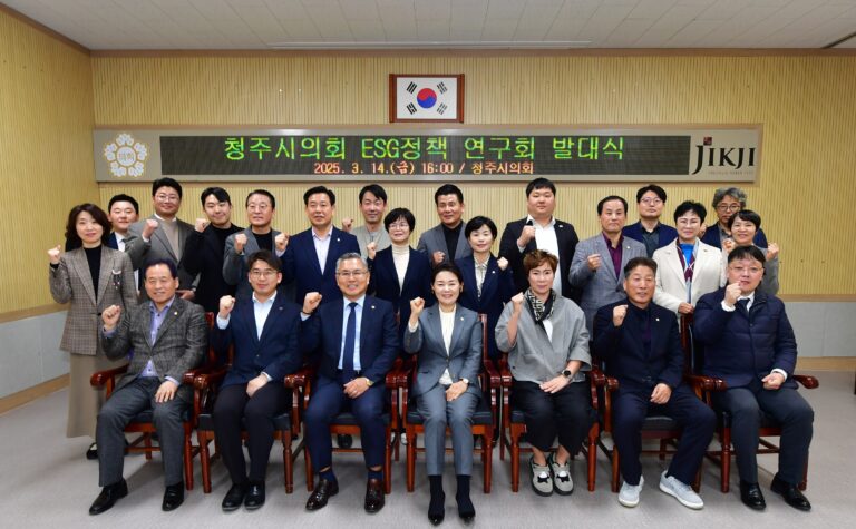 청주시의회 의원 연구단체인 「청주시의회 ESG정책 연구회」(대표 김은숙 의원)가 지난 14일 청주시의회 특별위원회실에서 발대식을 열고 본격적인 연구 활동을 시작했다. 이번 연구회는 청주시의 지속가능한 발전과 시민 삶의 질 향상을 목표로, ESG(환경·사회·거버넌스) 정책 연구 및 실천 방안을 마련하기 위해 구성되었다. 연구회는 김은숙 대표의원을 비롯해 김완식, 신민수, 이우균, 유광욱, 정연숙, 정재우, 최재호, 한동순, 허철, 홍순철 의원 등 총 11명의 시의원으로 구성됐다.