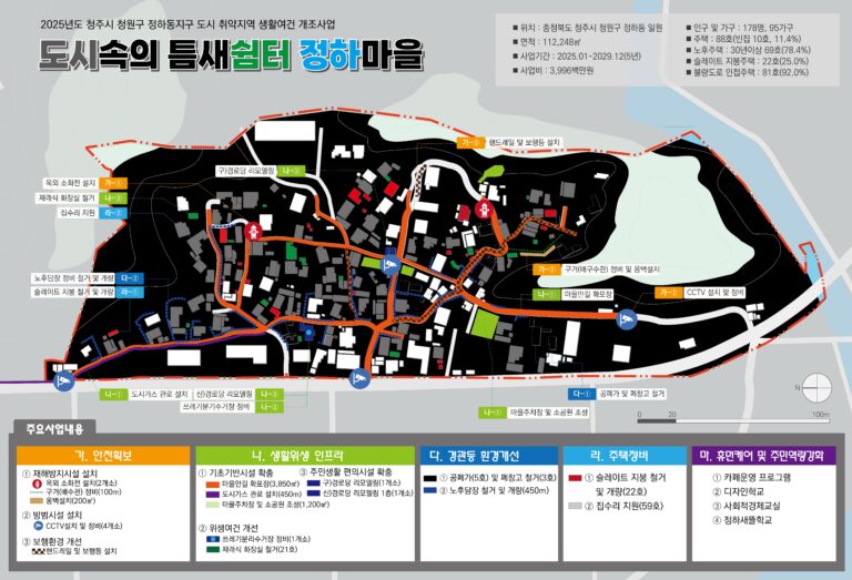 청주시는 2025년 취약지역 생활여건 개조사업 공모에 3개 마을이 선정됐다고 24일 밝혔다. 선정된 곳은 청원구 정하동 도시마을 1곳과 청원구 북이면 화상1리, 현암2리 농촌마을 2곳이다. 이 사업은 주거환경이 열악한 지역을 선정, 안전‧위생 등 생활 인프라를 확충해 주거환경을 개선하는 것이 핵심이다. 취약계층비율이 높고, 30년 이상 노후주택 또는 슬레이트 지붕 가구 비율이 40% 이상인 낙후지역이 사업대상이다.