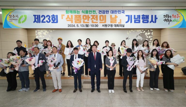 청주시는 13일 서원구청 대회의실에서 ‘함께하는 식품 안전, 건강한 대한민국’이라는 주제로, 제23회 식품안전의 날 기념행사를 개최했다.  이번 기념식에는 이범석 청주시장, 김은숙 청주시의회 부의장을 비롯한 시의원, 식품위생단체·급식관리지원센터 관계자, 소비자 식품위생감시원 등 120여명이 참석했다.행사는 식품안전관리 및 시민 보건 향상에 기여한 식품 관련 종사자 및 식품위생분야 공무원 등 유공자(30명) 표창 수여, 부정불량식품 근절을 약속하는 결의문 낭독 , 식품안전다짐 퍼포먼스 순으로 진행됐다.