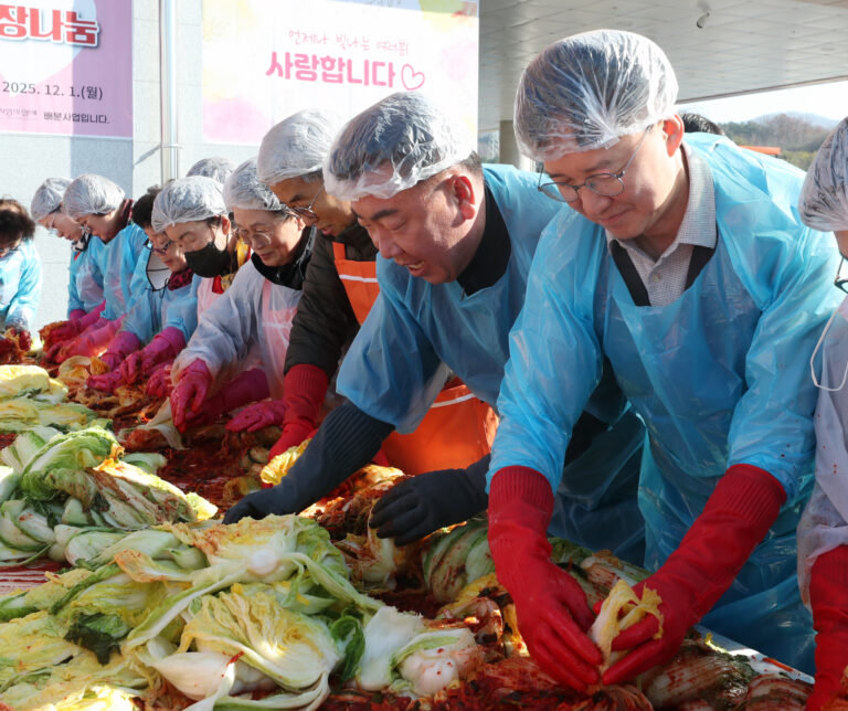 청주시와 청주시자원봉사센터는 1일 센터 마당(상당구 월운로 24)에서 SK하이닉스와 함께하는 2025년 사랑의 김장나눔 행사를 개최했다. 이날 행사에는 이범석 청주시장을 비롯한 시 관계자와 이일우 SK하이닉스 부사장 등 SK하이닉스 임직원, 읍·면·동 지역봉사대 대원을 포함해 총 100여명이 참여했다.