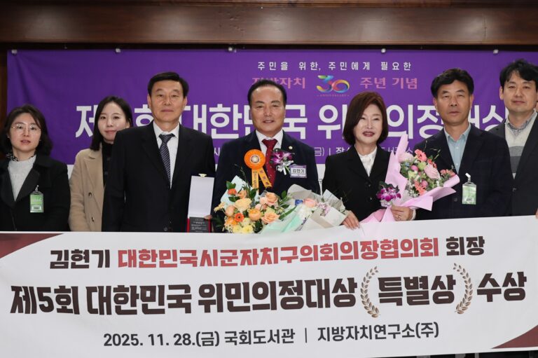 대한민국시군자치구의회의장협의회 김현기 회장(청주시의회 의장)은 28일 서울 국회도서관 소강당에서 열린‘제5회 대한민국 위민의정대상’시상식에서 지방의회 위상강화와 지방자치발전에 기여한 공로를 인정받아 특별상을 수상했다.