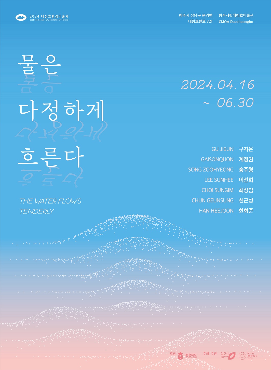 대청호미술관에서 4월 18일 오후 3시 개막식 진행 대자연인 대청호와 물의 속성을 포용력과 다정함이란 키워드로 재조명 청주시립미술관(관장 이상봉)은 18일 15시 청주시립대청호 미술관에서‘2024 대청호 환경미술제’ 개막식을 개최한다고 밝혔다. 이번 개막식에는 기관단체장, 미술 및...