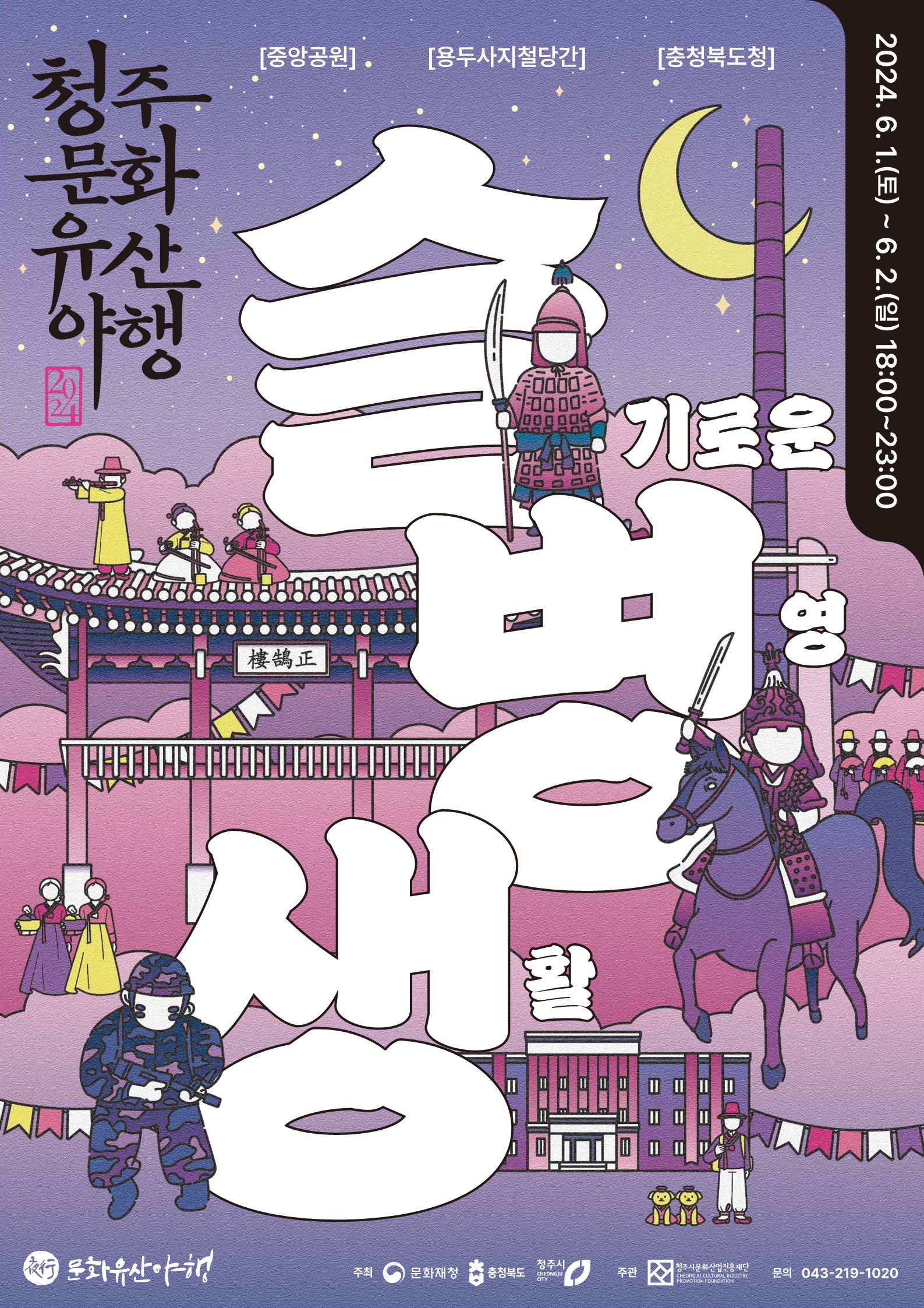 휘영청 밝은 달빛이 병영을 비추면 지축을 뒤흔드는 함성이 시작된다! 6월 1일부터 2일까지 2일간, 중앙공원 등 청주 원도심 일원에서 개최 ‘2024 청주 문화유산 야행’이 오는 6월 1일부터 2일까지 이틀간, 오후 6시부터...