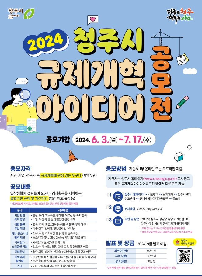 6월 3일부터 7월 17일까지 규제개혁 아이디어 청취 청주시는 오는 6월 3일부터 7월 17일까지 ‘2024 청주시 규제개혁 아이디어 공모전’을 개최한다고 밝혔다. 이번 공모전은 시민 및 현장 중심의 다양하고 참신한 규제개선 아이디어를 발굴해...