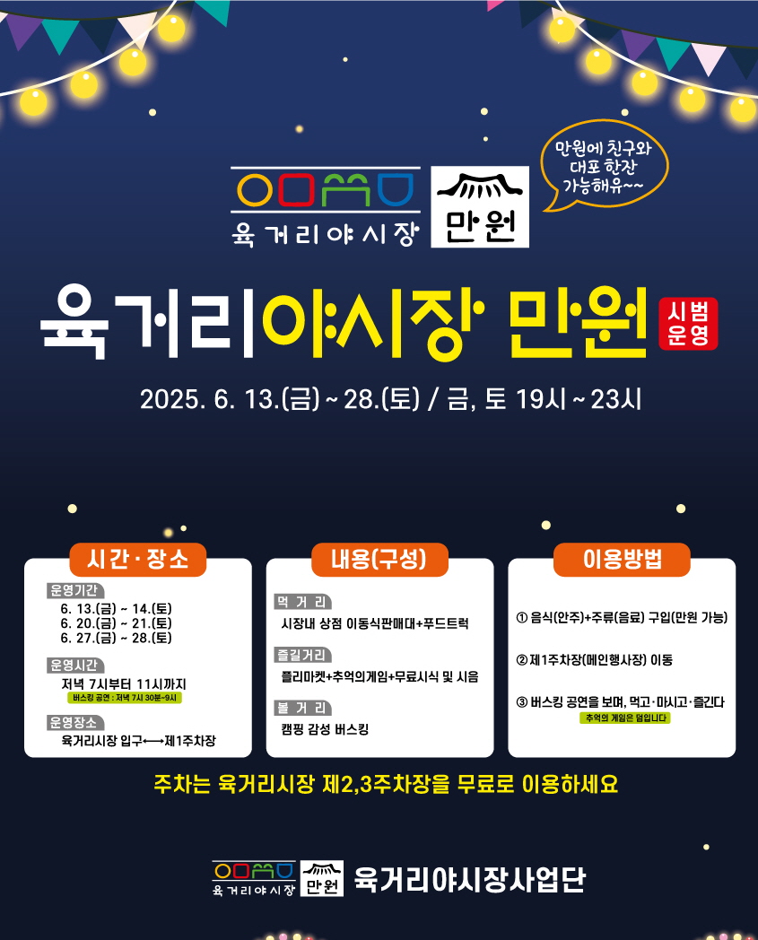 밤에도 꿀잼가득 전통시장… 13‧14, 20‧21, 27‧28일 오후 7~11시 운영 청주시 육거리시장의 6월 금요일과 토요일 밤이 화려한 야시장으로 변신한다. 시와 청주시활성화재단, 육거리야시장사업단은 야간형 꿀잼행사 ‘육거리야시장 만원’을 오는 13일부터 28일까지 매주 금․토요일...