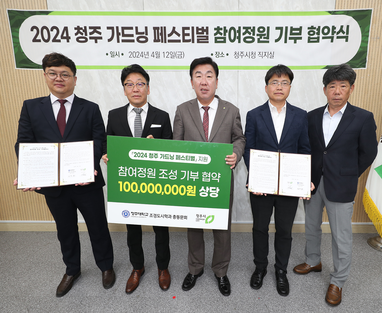 현대백화점그룹·(사)생명의숲, 청주대학교 조경도시학과 총동문회 정원 조성 기부 청주시는 12일 임시청사 직지실에서 현대백화점그룹·(사)생명의숲 , 청주대학교 조경도시학과 총동문회(회장 김민중)와 청주 가드닝 페스티벌 참여정원 전시 후원 협약식을 가졌다. 협약식에는 이범석 청주시장, 현대백화점그룹...