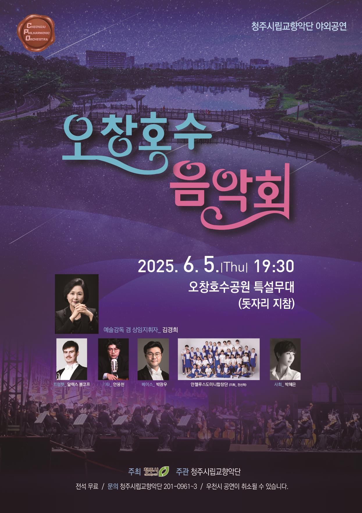 오창호수공원 특설무대서 오후 7시30분… 우천시 오창커뮤니티센터서 청주시립교향악단(예술감독 겸 상임지휘자 김경희)은 오는 6월 5일(목) 오후 7시 30분 오창호수공원 특설무대에서 ‘오창 호수음악회’를 개최한다. 이번 공연은 김경희 예술감독의 카리스마 넘치는 지휘와 교향악단의 요한...