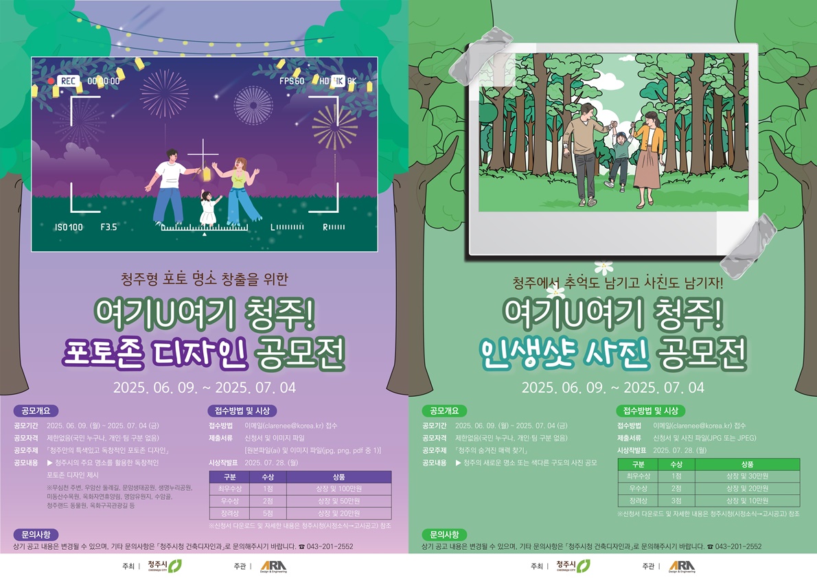 참신한 포토존, 숨겨진 명소 발굴 목표… 7월 4일까지 이메일 접수 – 청주시가 도시 곳곳 매력적인 장소를 발굴하고 관광콘텐츠로 활성화하기 위해 ‘여기U여기 청주!’ 포토존 디자인과 인생샷 사진 공모전을 개최한다. 이번 공모전은 청주의...